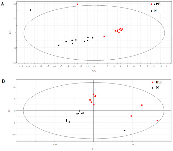 PLS analysis of NGS data on read counts of miRNAs in the blood serum samples from patients of the second cohort. (A) The arrangement of blood serum samples from women with ePE and without PE (N). (B) The arrangement of blood serum samples from women with lPE and without PE (N).