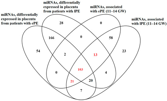 Table 4 shows that miRNAs correlating with the UAPI, b-hCG, and PAPP-A can modify the expression of the target genes involved in the occurrence of vascular disease, placental insufficiency, and pre-eclampsia, according to the miRWalk database. To further consider only placenta-specific miRNAs among the molecules listed in Table S5, a Venn–Euler diagram was plotted (Figure 3), and the intersection of the following lists of miRNAs was identified: “differentially expressed miRNAs in placenta from patients with ePE at the time of delivery” (Table S1, Sheet 2), “circulating miRNAs associated with ePE at 11–14 GW” (Table S5), “differentially expressed miRNAs in placenta from patients with lPE at the time of delivery” (Table S1, Sheet 3), and “circulating miRNAs associated with lPE at 11–14 GW” (Table S5).