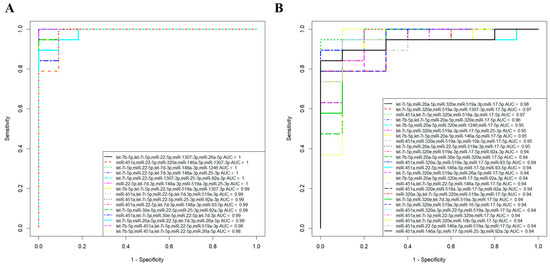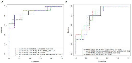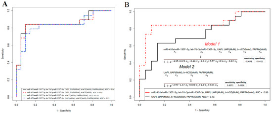 Logistic regression models for predicting PE in the first trimester of pregnancy according to biochemical and ultrasound parameters and miRNA levels. (A) Models based on the combination of biochemical and ultrasound parameters and miRNA levels. (B) Comparison of two models based on the biochemical/ultrasound parameters with or without the miRNA level dataset.