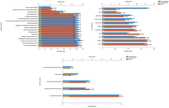 The signaling pathways, potentially regulated by the miRNA predictors of PE identified in this study (Figure 4), were analyzed using the FunRich program (Figure 7). Among them were signaling pathways with a known role in the pathogenesis of PE, namely, the ErbB, EGFR, IGF1, PDGF, TRAIL, and mTOR signaling pathways, as well as those mediated by the action of focal contact kinase and plasminogen activator urokinase type (Figure 7). Moreover, the protein products of the target genes of the identified miRNA predictors of PE were mainly regulators of transcription factor, protein serine/threonine kinase, and ubiquitin-specific protease activity.