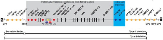 Dozens of genes and/or transcripts are identified between chromosome 15q11-q13 breakpoints associated with PWS and are prone to non-homologous recombination leading to 15q11-q13 deletions observed in PWS. Genes in the 15q11-q13 region contain both imprinted (NDN, MAGEL2, MKRN3, SNURF-SNRPN, SNORDs, UBE3A, ATP10A) and non-imprinted (NIPA1, NIPA2, CYFIP1, TUBGCP5, GABA receptors, OCA2) genes [,,]. These genes and their encoded protein functions are implicated in neurodevelopment, motor control, behavioral issues, learning disabilities, autism, hyperphagia, obesity, hypogonadism, infertility, precocious puberty, sleep disturbances, skin pigment production, and hormone and metabolic disturbances (Figure 1) [,,,,,].