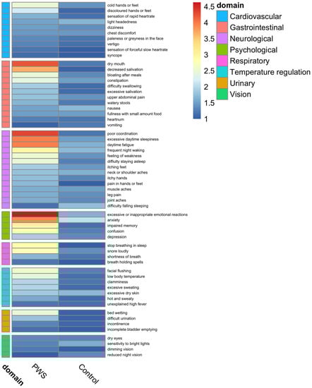 An ANS symptom questionnaire was used to describe the self-reported presence and frequency of symptoms on an ordinal scale: 0 = never, 1 = <once per month, 2 = 2–4 times per month, 3 = 5–7 times per month, 4 = most days, and 5 = daily. Of this cohort, 90% (n = 18) of the participants with PWS and 70% (n = 19) of the controls completed their ANS evaluation. Comparison of results in PWS individuals versus controls is shown in a heatmap (Figure 2). There were significant differences in the presence and frequency of various domains, including cardiovascular (i.e., discoloration of hands or feet), gastrointestinal (i.e., dry mouth, decreased saliva secretion, bloating, feeding difficulty, and food preoccupation), thermoregulation (i.e., flush, low temperature, and excess sweat), neurological (i.e., lack of coordination in movement, fatigue, excessive daytime sleepiness, pain tolerance, sleeping issues, feeling of weakness, and pain in hands/feet), and psychological (excessive/inappropriate emotional reactions, anxiety, socialization, memory, confusion, learning disability, school performance, and tics) symptoms between the two groups. Dry mouth and decreased saliva secretion, lack of coordination in movement, and excessive/inappropriate emotional reactions were particularly common in PWS.