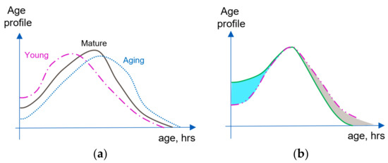 Figure 1a graphically illustrates possible changes to the cell age profile of the same cell population due to aging (corresponding profile curves are rather arbitrary and are used to visualize corresponding changes). Figure 1b illustrates the rejuvenation of the cell population reflected in its age profile due to the “addition of newly born cells” (intensified proliferation) and targeted removal of the older cells. It is also clear that because aging of different body organs and tissues can be different, e.g., [72,73], concurrent age profiles of different cell populations in the body and corresponding cell age distributions can differ even for the same subject at the same moment of time.