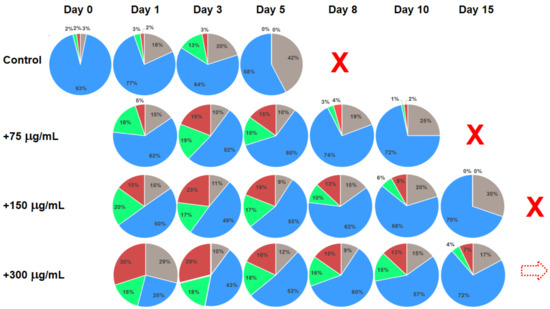 Figure 2 presents the results of substance testing experiments on ex vivo human blood mononuclear cell culture. Circular diagrams represent the percentage of the cells in corresponding cell cycle stages and apoptosis acquired using flow cytometry. Columns represent corresponding profiles taken at increasing duration of cell culture incubation. The tested substance was added on Day 0 after the initial control profile was acquired. Rows represent different concentrations of the added substance (Control: no substance added; 75, 150 and 300 μg/mL). With no added substance, the culture survived for only 8 days. With the addition of 75 and 150 μg/mL on Day 0, the culture survived until Day 15 and 20, correspondingly. With the addition of 300 μg/mL on Day 0, the culture was still active until the experiment was terminated on Day 20.