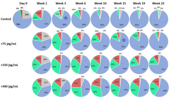 Figure 3 presents the results of the substance testing experiments on human dermal fibroblast culture. Circular diagrams represent percentage of the cells in corresponding cell cycle stages and apoptosis acquired using flow cytometry. Columns represent corresponding profiles taken at increasing duration of cell culture incubation. The test substance was added on Day 0 after the initial control profile was acquired, and cell stage profiles were consecutively recorded at the end of following weeks. Rows represent different concentrations of the added substance (Control: no substance added; 70, 150 and 300 μg/mL). The experiment was terminated after 22 weeks of incubation.