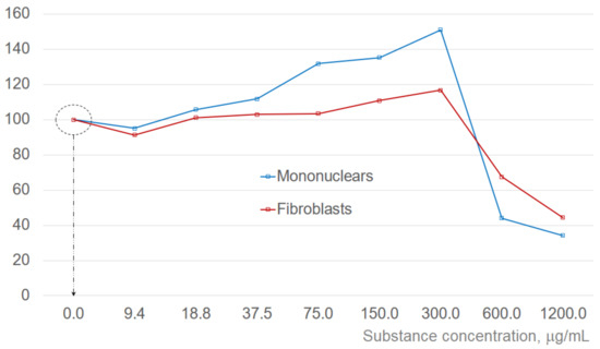 Estimations of half-maximal effective concentration values for the enhancement of cell proliferation referenced to the control (not taking into account decreasing values at small concentrations and concentrations exceeding 300 μg/mL) give EC50fibroblasts ~62.8 and EC50MNC ~125.1 μg/mL, correspondingly.