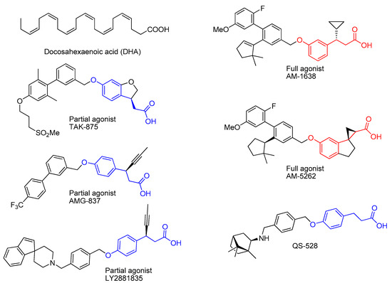 Endogenous (DHA) and synthetic FFAR1 (TAK-875, AMG-837, LY2881835, AM-1638, AM-5262, QS-528) agonists.