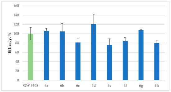 Analyzing the FFAR1 activation data (Figure 2), we observed that all the compounds studied were agonists of the FFA1 receptor at a concentration of 10 μM. The efficacy of compounds 6a–h ranged from 76% to 120%. Compounds 6a,b,d,g showed greater efficacy (104–121%) whereas compounds 6c,e,f,h showed slightly less efficacy (76–84%). It seemed that the derivatives containing a para-substituted phenylpropanoic acid fragment tended to exhibit greater efficacy than their meta-substituted counterparts (except for compounds 6c and 6g).