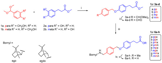 Target compounds synthesis. Only the para-para-substituted version of compounds 3–6 is presented in the scheme. Reagents and conditions: (i) DIAD, PPh3, THF, 0 °C to r.t.; (ii) 3% H2SO4, THF. Reagents and conditions: (iii) bornylamine (bornylNH2), NaBH(OAc)3, AcOH, CH2Cl2, 0 °C to r.t.; (iv) LiOH, MeOH, THF, H2O; (v) HCl, H2O.
