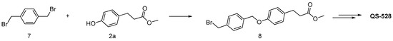 In previous work [24], we used 1,4-bis(bromomethyl)benzene 7 as a building block for the synthesis of the target compound QS-528, but in scaling up we faced problems in needing to use a considerable amount of dibromide as well as difficulties in its separation from the reaction product (Scheme 2).
