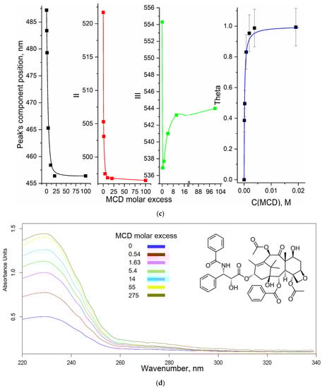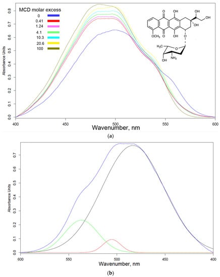 Spectral methods provide information about the changes in microenvironment of functional groups upon intermolecular interactions. A wide range of methods for determining parameters of drug–cyclodextrin interactions are described in the literature, including FTIR [,], NMR spectroscopy [,,,,,], fluorescence [,,,], and electrochemical methods []. Molecular absorption spectroscopy using mathematical functionality is a worthy method of tracking the inclusion of various drugs in the hydrophobic cavity of cyclodextrin. It is known that aromatic molecules form non-covalent complexes with CD of the order of 10−2–10−6 M, which makes it possible to create, on the one hand, a simple, but at the same time effective shell for the drug. The inclusion of antitumor drugs in CD is promising in terms of enhancing penetration into cancer cells and the possibility of using adjuvants from plant extracts.
