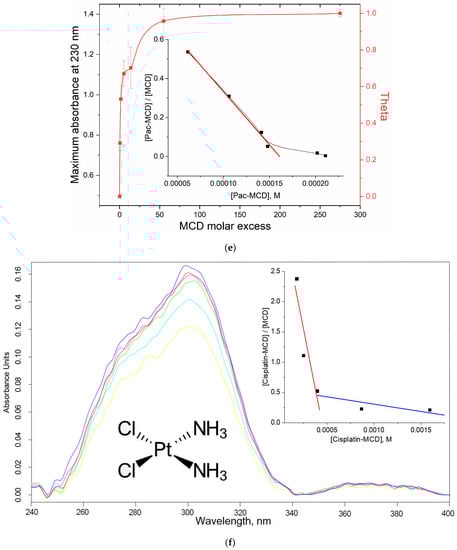 The absorption peak positions and maximums of absorbance can be considered as the analytical signal indicated for drug–MCD complex formation (Figure 1). Data in the Scatchard coordinates allow the calculation of the drug–MCD dissociation constants (Table 1). It is worth noting that the interaction of unmodified CD with Dox, Pac, cisplatin and vincristine is weak (Kd 10−2–10−3 M), which does not allow CD to be used as a delivery system. However, significantly better interactions with drugs were observed for modified CD (Kd 10−4–10−5 M), as presented in Table 1.