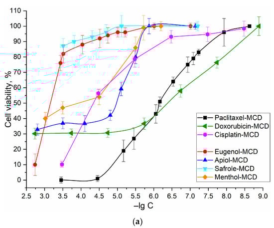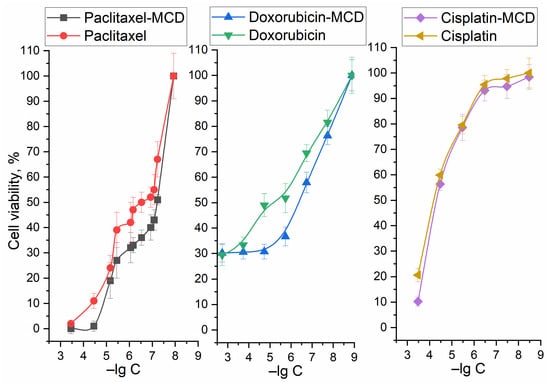 We composed inclusion complexes of cytotoxic agents Pac, Dox, and cisplatin with MCD. Figure 2 shows the effect of the cytostatic drug inclusion in MCD on the anti-A549 activity. The most striking effect is observed for Pac: cell survival is reduced by 10–15%. For Dox, the role of cyclodextrin is noticeable at Dox concentrations of 1–10 μM. For cisplatin, the effect of the MCD is the most pronounced at high concentrations of cytostaticity, which is due to the prevention of hydrolysis of the drug (the most specific reason for cisplatin).