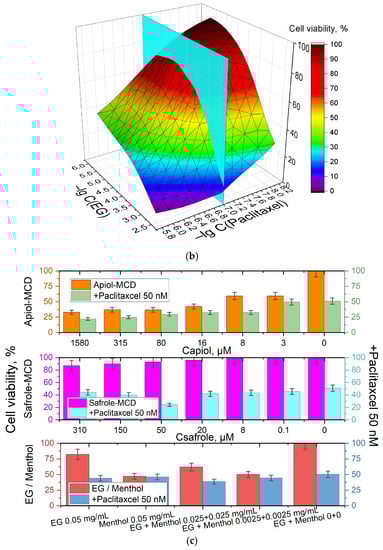 So, the strongest synergism effect is characteristic of Pac when enhanced with EG and safrol at concentration of 0.1–5 mM (Table 2). The main idea of the work is not only to strengthen antitumor drugs (Table 2) but also to partially replace toxic components with biocompatible extracts. Thus, the fact of the effectiveness of the cytostatic + adjuvant formulation has medical significance in the long term (reduction of IC50 and minimization of side effects).