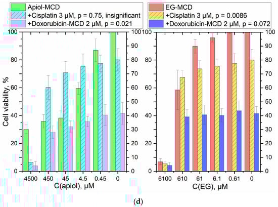Apiol has an enhancing effect on both Dox and cisplatin (Figure 3d): a decrease in the survival rate of A549 cells from 84 to 40% and from 80 to 7%, respectively. EG has the same effect, but with a greater concentration.