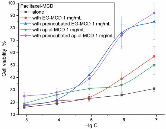 Dependences of HEK293T cell survival on the logarithm of concentration of Pac alone and in mixture with EG 1 mg/mL or apiol 1 mg/mL simultaneously added and in the mode of pre-incubation of adjuvants. The conditions are the same as indicated in the caption to Figure 2. Preincubation of EG and apiol for 1 h. All compounds are used in the form of complexes with MCD; lg C (logarithm of the concentration of the test substance).