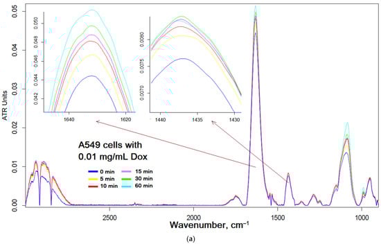 Figure 5 shows the FTIR spectra of A549 cells depending on the time of incubation with Dox in low and high concentrations to monitor the state of cells upon drug actions or to follow the status of the cytostatic itself, respectively, which allows you to find out which functional groups of the drug molecule are involved in interaction with the appropriate cellular components. Figure 5a shows changes in the status of A549 cells: the intensity of peaks 2850–2950 cm−1 increases, which corresponds to the loosening of the membrane due to penetration of Dox; the intensity of amide I increases (1630 cm−1) and a shoulder appears at 1640 cm−1, which indicates the involvement of surface and transmembrane proteins at Dox binding; a change in the peak at 1086 cm−1 indicates the penetration of Dox into the cells.