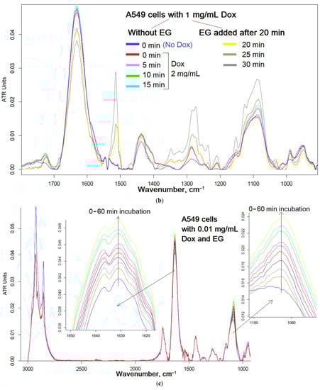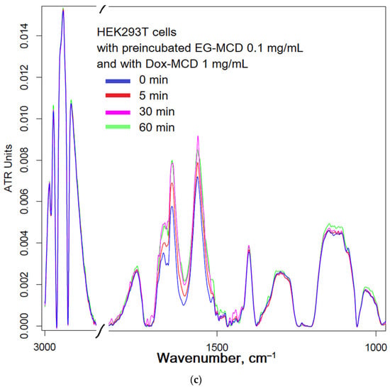 FTIR spectra of HEK293T cells’ suspensions (106 cells/mL) during incubation with: (a) Dox 1 mg/mL, (b) EG 0.1 mg/mL, (c) Dox 1 mg/mL added after 30 min incubation of cells with EG 0.1 mg/mL. All compounds are used in the form of complexes with MCD. T = 37 °C.