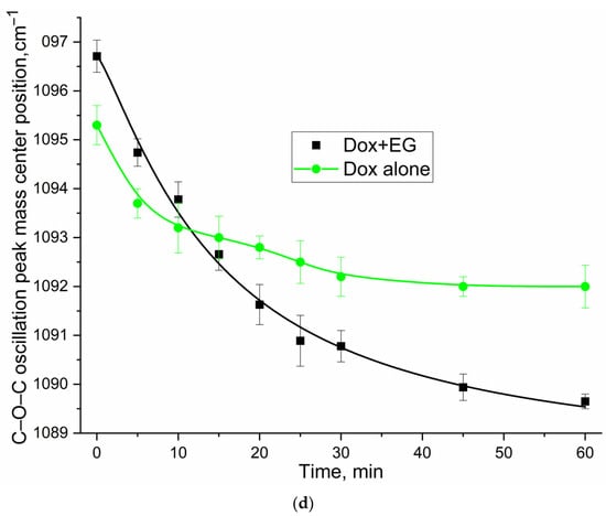 FTIR spectra of A549 cells’ suspensions (106 cells/mL) during incubation with: (a) Dox 0.01 mg/mL, (b) Dox 1 mg/mL and EG 0.1 mg/mL added after 20 min of incubation, (c) Dox 0.01 mg/mL and EG 0.1 mg/mL added simultaneously. (d) Dependence of the center mass position of the peak of C–O–C oscillations on time of incubation for graphs (a,c). All compounds are used in the form of complexes with MCD. T = 37 °C. The statistical residual difference between the curves for (d) is significant; p-value is 0.0021.