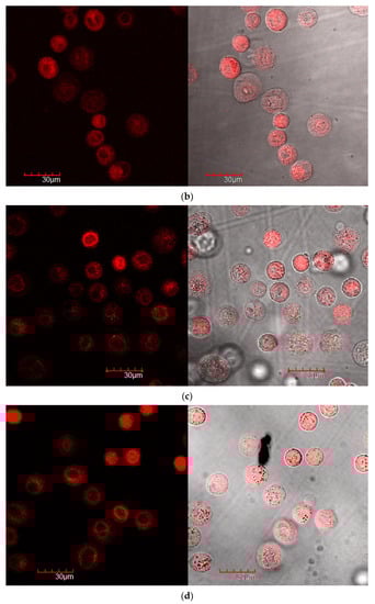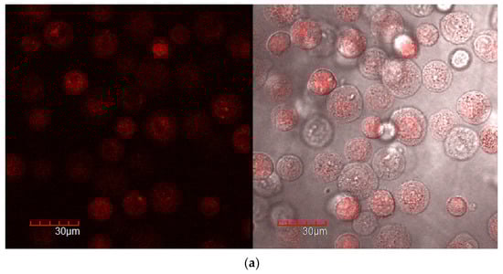 Quantitatively, the accumulation of Dox in cells is characterized by cell-associated fluorescence (Figure 8), determined by the difference in the fluorescence intensity of the cells before and after incubation with cells and by analyzing confocal images (pixel intensity integral). For cancer cells, accumulation over a time of 15 min is given in the manuscript (Figure 7), and for the rest of the time intervals—in the Supplementary Materials (Figures S1 and S2).