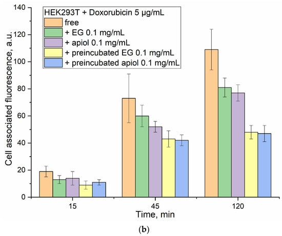 Cardinally different situation is observed for healthy HEK293T cells. EG and apiol reduce the accumulation of Dox in healthy cells by 20–30%, and pre-incubated adjuvants are much more effective.