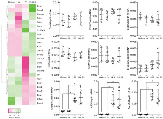 The expression levels of selected genes in BMDMs upon indoxyl sulfate (IS) and LPS treatment. The heat map shows the expression analysis of pre-selected transcripts. Genes indicated in green are upregulated and genes indicated in pink are downregulated to highlight differences between the samples. The rows are Z-score scaled for each gene separately to ensure that the expression patterns are not overwhelmed by the expression values of highly expressed transcripts. Dot plots represent the expression of selected genes and demonstrate that the distinction in color in the heat map could be a consequence of a variation in expression or low expression level. Data are shown as means ± SD; dots represent biological replicates; * p < 0.05.