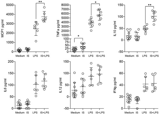 Indoxyl sulfate induces the production of inflammation-related cytokines. The secretion of inflammatory mediators was measured by a bead-based flow cytometric assay after 24 h in supernatants from bone marrow-derived macrophages (BMDMs); we cultured the cells in medium containing 60 µg/mL of indoxyl sulfate (IS) and stimulated them with LPS (2 ng/mL) for 24 h. Data are shown as means ± SD; dots represent biological replicates; * p < 0.05, ** p < 0.01.
