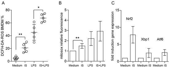 Indoxyl sulfate significantly enhances ROS production and affects redox regulation in macrophages. (A) BMDMs were generated, primed, and left either unstained or stained with ROS probes; dots represent biological replicates. (B) Mitochondrial superoxide production was detected with MitoSOX and presented as MFI fold induction (n = 5). (C) The figure shows the fold induction of mRNA expression levels of redox/ER stress-associated genes in BMDMs (n = 4). We cultured the cells in medium containing 60 µg/mL of indoxyl sulfate (IS) for 4 h. Data are shown as means ± SD; * p < 0.05, ** p < 0.01.