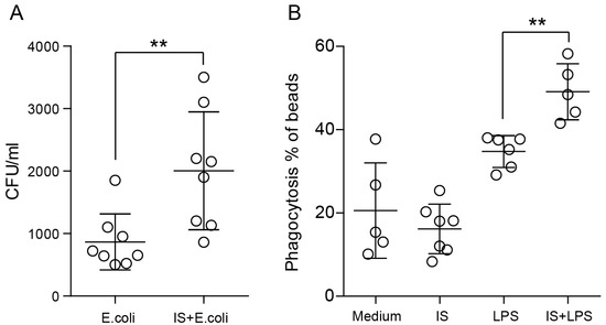 Indoxyl sulfate affects phagocytosis in macrophages. (A) We infected macrophages with Escherichia coli at an MOI of 1:10. At 24 h after infection, cell lysates were collected and plated onto LB plates for the enumeration of intracellular bacteria (CFU). (B) Uptake of beads by BMDMs measured by flow cytometry. Basal measurements were made in the absence of beads or at 4 °C. Three independent, representative experiments are presented. Data are shown as means ± SD; dots represent biological replicates; ** p < 0.01.