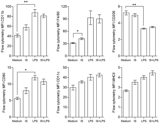 The original concept of classical and alternative macrophage polarization is associated with their role in inflammation and disease and is often linked to the balance of immune responses [38]. Therefore, we investigated the role of indoxyl sulfate in macrophage polarization to elucidate its role in this complex spatiotemporal subject. Surface expression of macrophage differentiation and activation markers were analyzed by flow cytometry and presented as the single-stain mean fluorescence intensity (MFI) in indoxyl sulfate- and LPS-stimulated BMDMs. F4/80 and CD11b markers were expressed at high levels on LPS-stimulated cells, confirming the sufficient differentiation of primary cells (Figure 6). As expected, cells also showed expression of the costimulatory molecule, CD80, mannose receptor, CD206, and MHCII. LPS-treated macrophages exhibited the typical M1-like phenotype characterized by strong induction of CD80, MHCII, and downregulation of CD206 compared to plain medium-cultured macrophages in terms of their percentage of positive cells and MFI. The cells treated with indoxyl sulfate displayed similar phenotypic features to the cells cultured in plain medium, suggesting that there were minor effects on macrophage phenotypic changes under the tested conditions. Similarly, under proinflammatory conditions, we did not observe any differences in the MFI between macrophages stimulated with both indoxyl sulfate and LPS, and those treated with LPS only, in terms of both the percentage of positive cells and MFI.