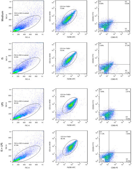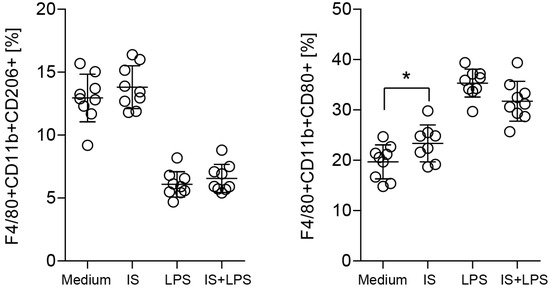 Expression of protein markers in indoxyl sulfate (IS) and LPS-stimulated macrophages. Flow cytometry staining of surface macrophage and myeloid cell markers was detected 24 h post-stimulation under indicated conditions. Flow plots correspond to the alive/CD11b/F4/80 gate. Quantification shows the proportion of M1-like and M2-like macrophages with a CD80+ (proinflammatory) or CD206+ (anti-inflammatory) phenotype at 24 h. Data are shown as means ± SD; dots represent biological replicates; * p < 0.05.