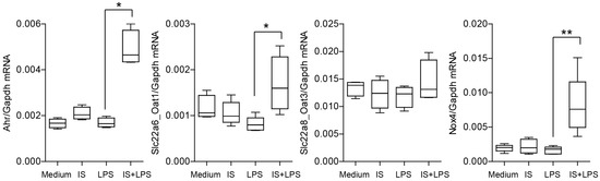 Indoxyl sulfate significantly affects the expression of Ahr, Oat1, and Nox4 in BMDMs under inflammatory conditions. The figure shows mRNA expression levels of inflammation-associated genes in BMDMs. We cultured the cells in a medium containing 60 µg/mL of indoxyl sulfate (IS) and stimulated them with LPS (2 ng/mL) for 4 h. Data are shown as box plots (n > 4); * p < 0.05, ** p < 0.01.