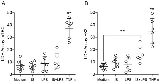 Effect of indoxyl sulfate on the viability of tubular epithelial cells. (A) The viability of mouse tubular epithelial cells (TECs) was measured using an LDH assay upon LPS stimulation (200 ng/mL) and in the absence or presence of indoxyl sulfate (IS). (B) The viability of the human kidney epithelial cell line HK2 was measured using an LDH assay upon LPS stimulation (200 ng/mL) and in the absence or presence of indoxyl sulfate (IS). Data are shown as means ± SD; dots represent biological replicates; ** p < 0.01.