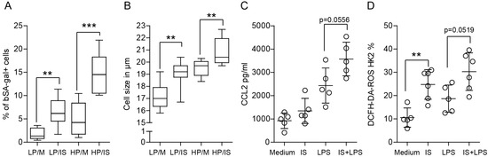 Indoxyl sulfate significantly affects cell senescence and the inflammatory response of tubular epithelial cells. (A) SA-β-gal expression and (B) cell size in low passages (LP < 10) and high passages (HP > 25) of tubular epithelial cells after the induction of cellular senescence with indoxyl sulfate. (C) High passage cells stimulated with indoxyl sulfate and/or LPS were investigated for signs of inflammation (CCL2 ELISA upon 24 h of stimulation and (D) ROS production upon 4 h of stimulation). Data are shown as box plots (n > 4) or means ± SD; dots represent biological replicates. ** p < 0.01. *** p < 0.001.