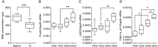 Indoxyl sulfate significantly affects the cell senescence-like phenotype of tubular epithelial cells. (A) The concentration of isolated RNA was constantly lower in tubular epithelial cells after stimulation with indoxyl sulfate (n = 9). (B–D) Box plots showing mRNA expression levels of senescence-associated genes in renal tubular cells isolated from young mice (YS) or old mice (OS). We cultured the cells in a medium containing 60 µg/mL of indoxyl sulfate (IS) for 72 h (n = 4). Data are shown as means ± SD; * p < 0.05, ** p < 0.01, *** p < 0.001.