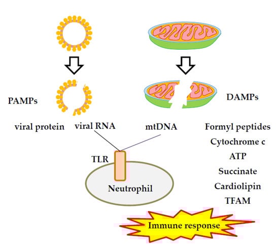 SARS-CoV-2 infects mitochondria and forms double-membrane vesicles which, in turn, leads to the release of mtDNA into circulation and the activation of the immune response, resulting in a severe pro-inflammatory state [139]. The mtDNA variation in COVID-19 patients can predict the degree of disease and the risk of developing severe disease [140,141]. After apoptosis, mtDNA is released, further aggravating local and systemic inflammatory responses [142]. Positive correlations between mtDNA levels and pro-inflammatory markers have been determined in the plasma of COVID-19 patients [143,144]. This is now used an indicator of COVID-19 severity or a predictor of mortality. Moreover, when mtDNA is released into the cytosol, it acts as a DAMP, which, in turn, causes a “cytokine storm” and inhibits cellular regulation of excessive inflammatory responses [143].