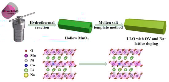 Figure 1 shows the synthesis process of the 1D rod-like structure LLO-Na-OV prepared by the molten salt template method. We first prepared hollow MnO2 with a rod-like structure by a simple hydrothermal method and then mixed it with nickel salt, cobalt salt, and lithium salt to a homogeneous state by stoichiometric number. Simultaneously, sodium chloride was added four times the number of moles expected to be synthesized. At a high temperature of 900 °C, NaCl would form a molten salt, which could fully contact the raw materials of each component and avoid the drawbacks of particle agglomeration in the traditional solid-state method. Moreover, hollow MnO2, as a manganese source and a synthetic template, provided numerous anchor points for Li, Co, and Ni ions due to its unique structure, so that LLO could be directly prepared on the original morphology. During the synthesis process, the materials were all in the NaCl flux environment, which also provided convenience for LLO to do Na+ lattice doping and induced oxygen vacancies. In addition, ICP detection was adopted to verify that the stoichiometry of the as-prepared samples was consistent with the preset target Li1.2Ni0.13Co0.13Mn0.54O2, and the detailed parameters are shown in Table S1.