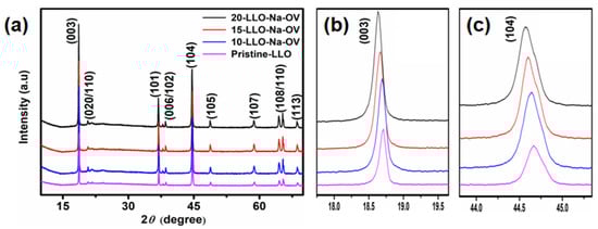 (a) XRD patterns of Pristine-LLO, 10-LLO-Na-OV, 15-LLO-Na-OV, and 20-LLO-Na-OV; (b,c) the magnification pattern of (003) and (104) peaks.