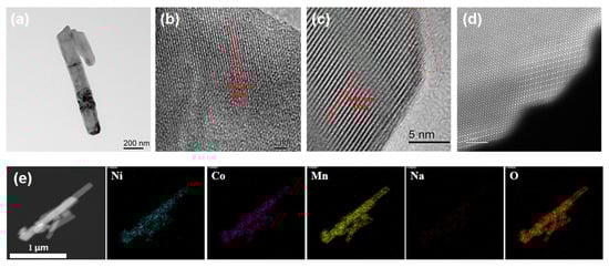 TEM, HRTEM, and HAADF-STEM were used to further collect the structural information and observe the morphology of 15-LLO-Na-OV, as shown in Figure 3. Intuitively, 15-LLO-Na-OV has a well-crystalline structure, and the 1D rod-like morphology of MnO2 is effectively inherited (Figure 3a). In HRTEM images, two groups of lattice spacing d1 = 0.42 nm (Figure 3b) and d2 = 0.47 nm (Figure 3c) can be measured, corresponding to (020) crystal plane of Li2MnO3 monocline structure and (003) crystal plane of layered α-NaFeO2 structure, respectively [24,25]. In addition, it can be observed that at the edge of the sample, small ridges (red dotted lines) appear in the lattice of the (003) crystal plane, which may be formed by the Na+ substitution of the Li site in the Li layer. Furthermore, significant stacking faults due to the increase in lattice spacing after Na+ entry into the lattice are also observed (green dashed line). Then, the atomic resolution HAADF-STEM images further confirm the Na+ lattice doping in LLO (Figure 3d), and it can be intuitively seen that the highly crystallized layered structure along the (003) crystal plane in the sample and the interlayer substitution of Na+ in the Li plate. Therefore, through the above analysis, it can be demonstrated that 15-LLO-Na-OV achieves Na+ doping substitution of the Li site in the Li layer during the preparation process, which is also because the Li site in the Li layer is more mobile and easier to be replaced than Li+ in TM site [26]. In addition, the EDS mapping of 15-LLO-Na-OV is also given (Figure 3e), indicating the uniform distribution of Ni, Co, Mn, Na, and O atoms in the sample.
