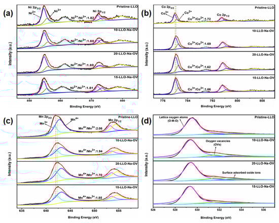 In order to analyze the valence state of the elements in the sample and the influence of Na+ doping, XPS measurement technology was applied. As shown in Figure S5, the peaks of Ni, Co, Mn, O, and Na elements can be found in all samples, except that the Na element cannot be found in the Pristine-LLO sample spectrum. For the Ni 2p spectrum (Figure 4a), Ni 2p3/2, Ni 2p1/2, and their satellite peaks are distributed around 854, 872, 861, and 879 eV, respectively. Moreover, two fitting peaks of Ni3+ and Ni2+ at 856 and 855 eV can be obtained by peak fitting of Ni 2p3/2, which is consistent with the literature [27]. While in the Co 2p spectrum (Figure 4b), Co 2p3/2 and Co 2p1/2 are located at 780 eV and 795 eV, respectively. Of course, fitting the Co 2p3/2 spectrum peaks also yielded Co3+ and Co2+ fitting peaks at 779 eV and 781 eV [28]. Similarly, for the Mn 2p spectrum, Figure 4c shows two peaks at 642 and 654 eV, representing Mn 2p3/2 and Mn 2p1/2. After fitting to Mn 2p3/2, two fitting peaks at 642 and 643 eV point to Mn3+ and Mn4+ [29]. Through careful comparison, it can be seen that in all samples, the valence state of Ni element (Ni2+/Ni3+ both remain around 1.81) remains unchanged. On the contrary, the valence ratio of Mn and Co has shifted. From Pristine-LLO to 20-LLO-Na-OV, Mn4+/Mn3+ are 2.06, 1.94, 1.85, and 1.70, respectively. Co3+/Co2+ are 1.72, 1.69, 1.66, and 1.62, respectively. This can be attributed to the presence of OV which reduces the valence state of Mn and Co elements. For this purpose, the spectrum of O 1s is presented in Figure 4d. After fitting, three strong peaks at 529, 531, and 533 eV can be obtained, corresponding to lattice oxygen atoms, oxygen vacancies, and surface-adsorbed oxide ions in the sample, respectively [30]. Intuitively, the OV peaks in the Pristine-LLO samples are significantly lower than those in the LLO-Na-OV samples prepared by the molten salt template method, indicating that they generate numerous OVs during the preparation process [31]. Interestingly, the more OV in the sample and the fewer oxide ions adsorbed on the surface, the more it can suppress the oxygen loss of the Li2MnO3 component during the charging-discharging process, and it can also facilitate the diffusion of Li+ [32]. This will be shown later by the lithium-ion diffusion coefficient (Table S5).
