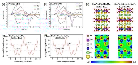 DFT calculations were introduced to explain the influence between OV and the valence states of Co/Mn elements and to elucidate the electrochemical performance mechanism. To simplify the calculation, two simple models were established: Li19Ni2Co2Mn9O32 and Li18Na1Ni2Co2Mn9O31, representing Pristine-LLO and LLO-Na-OV samples, respectively (the associated crystal structure diagram of the models are shown in Figure S6). The total density of states and the predicted density of states (TDOS/PDOS) of the two samples are shown in Figure 5a,b. In general, the spin-up part occupies the electronic state near the Fermi level, and the spin-down part has a band gap. This is similar to some of the literature reports [33]. The valence and conduction bands in the DOS diagram mainly contain TM 3d states and O 2p states, while their coincidence on the PDOS implies that the TMO6 octahedral unit mediates strong TM-O interactions. When LLO introduces Na+ and induces oxygen vacancies, the DOS curve does not change significantly, but the band gap widens slightly (from 0.35 eV to 0.44 eV). The LLO-Na-OV sample has a lower unoccupied state peak, which can reduce the probability of internal charge transitions and is beneficial to the stability of the structure [34]. In addition, average charge density curves are plotted to illustrate the effects of Na+ lattice doping and OV on the samples (Figure 5c,d). The average charge density of the Li layer increases due to the substitution of Li+ by Na+ doping in the Li layer but has no other effects. After the OV is generated, the average charge density of the O layer will decrease, thereby reducing the attraction to nearby Co and Mn elements. Therefore, the valence states of Co and Mn elements in the LLO-Na-OV sample will be lower than those in the Pristine-LLO sample, which is also consistent with the XPS analysis. In-depth, the corresponding deformation charge density, and its 2D section images are also displayed (Figure 5e), visually presenting the different degrees of influence of the O element on the electron gain and loss of the surrounding TM elements. It can be seen that the O atoms and TM atoms exhibit red and blue colors, respectively. The blueness of the Mn and Co atoms near OV decreases with the decrease of the redness of the O atom, which means that the Mn and Co atoms lose electrons to a lesser degree, thus reflecting their lower valence. However, the difference is that the blueness of the Ni atoms in the image has not changed, indicating that its valence state has not changed due to the generation of OV. This conclusion is highly consistent with the average charge density curve and XPS analysis results.