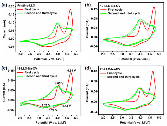 The CV plots at a scan rate of 0.1 mV s−1 of (a) Pristine-LLO, (b) 10-LLO-Na-OV, (c) 15-LLO-Na-OV, and (d) 20-LLO-Na-OV.