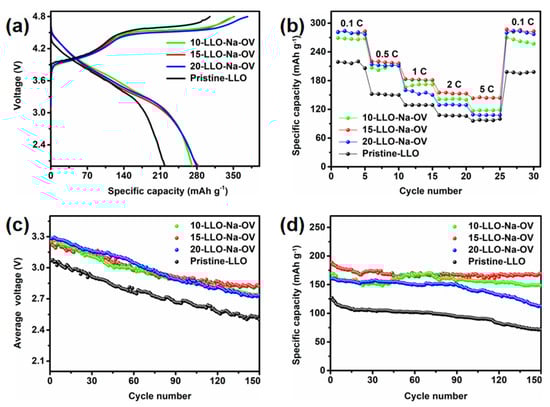 The electrochemical properties of Pristine-LLO, 10-LLO-Na-OV, 15-LLO-Na-OV, and 20-LLO-Na-OV: (a) initial charge-discharge curves at 0.1 C, (b) rate performances at 0.1–5 C, (c) median voltage curves at 1 C, and (d) cycling performance at 1 C.