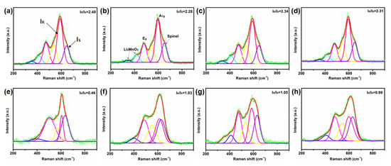 Raman spectra of (a,e) Pristine-LLO, (b,f) 15-LLO-Na-OV, (c,g) 10-LLO-Na-OV and (d,h) 20-LLO-Na-OV: (a–d) before and (e–h) after cycling.