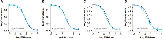 Totally desialylated FSH samples analyzed using the in vitro bioassay displayed differences in the shape of the dose–response curves (in particular in the low asymptote level), resulting in loss of parallelism with the RHS (Supplementary Figure S9A,B); however, no difference in the shape of the dose–response curves was observed with the totally desialylated samples analyzed using the in vivo bioassay (Supplementary Figure S9C). In vitro dose response was investigated to ensure that failure resulted from loss in sialylation rather than the presence of sialidase or its inhibitor in the samples. Indeed, additional samples were prepared as follows: the sialidase inhibitor was diluted in the sample at the same concentration as in the treated samples; then, the sialidase was added at the same concentration as in the previously treated samples. In this way, the sialidase was immediately blocked by its inhibitor, but it was possible to investigate the eventual impact of the enzyme and its inhibitor on the bioassay dose–response curve. The dose–response curves obtained with these samples showed good parallelism with the RHS concentration curve, demonstrating that loss in sialylation impacted on the shape of the dose–response curve.
