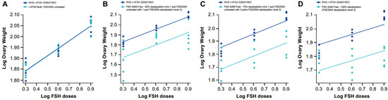 The aim of this study was to evaluate the suitability of a new in vitro bioassay, which was specifically developed to assess FSH biopotency for quality control purposes, and replace the currently used in vivo Steelman–Pohley bioassay described in EU Pharmacopoeia [15]. To achieve this, we assessed the ability of the in vitro bioassay compared with the currently used in vivo bioassay (Steelman–Pohley) to detect modifications in critical quality attributes generated through enrichment and enzymatic treatment in r-hFSH. Notably, for r-hFSH, the in vitro bioassay was recently approved by the European Medicines Agency (EMA) to replace the in vivo bioassay after obtaining a positive opinion from the Committee for Medicinal Products for Human use (CHMP) on 27 October 2022 for GONAL-f® and Pergoveris®.