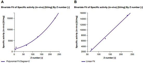 In vitro specific activity significantly increased with each level of desialylation (level 1: Δ% +40%, level 2: Δ% +73%, level 3: Δ% +101%) compared with untreated r-hFSH samples (Figure 3; Table 1). A linear correlation between z-score and in vitro specific activity was confirmed by a highly significant fit line slope (p < 0.001; R2 = 0.996). Conversely, a gradual decrease in in vivo specific activity correlated with desialylation level (Level 1: Δ% −56%, level 2: Δ% −81%, level 3: Δ% −87%) compared with untreated r-hFSH samples (Table 1). The correlation between z-score and in vivo specific activity was well described by a second-degree polynomial equation (R2 = 0.995) due to the fact that after the de-sialylated level 2 (75%; z-score = 68), the correlation curve reached a plateau (Figure 4A). A linear correlation between z-score and in vivo specific activity was observed when 100% desialylated samples (desialylation level 3) were not included in the analysis. This was confirmed by an almost significant fit line slope (p = 0.0582 and an R2 = 0.992) (Figure 4B).