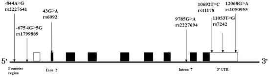 The 3’-UTR is an important region of mRNA transcripts that regulates gene expression through various mechanisms, such as polyadenylation, translation, and stability control, and by binding to regulatory proteins and miRNAs [,]. Several studies have suggested that polymorphisms in the 3’-UTR region of certain genes can have an impact on various diseases. For instance, a previous report indicated that rs7242 in the 3’-UTR of PAI-1 is linked with an increased risk of severe radiation pneumonitis in lung cancer patients []. Therefore, understanding the role of genetic variants in the 3’-UTR of PAI-1 is crucial for identifying the potential risk factors of various diseases. In this study, we investigated seven polymorphic sites in the promoter and 3’-UTR regions of PAI-1, including rs2227631, rs1799889, rs6092, rs2227694, rs11178, rs7242, and rs1050955, and we assessed their association with ischemic stroke risk in a Korean population.