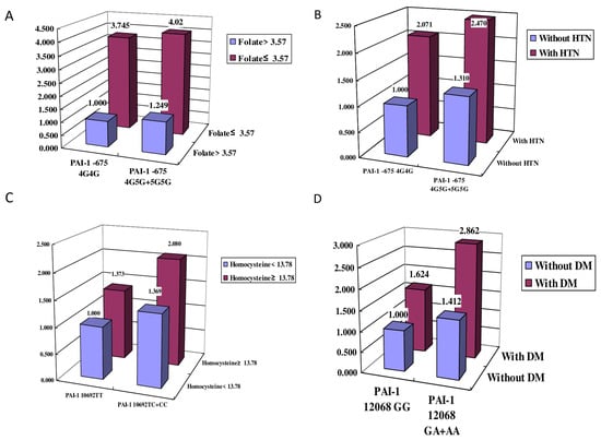 PAI-1 −675 4G5G + 5G5G with HTN was two-fold more likely to increase ischemic stroke than the 4G4G genotype without HTN and was three-fold more likely to increase ischemic stroke risk in patients with a folate level ≤ 3.57 nmol/L (Figure 2). In addition, the PAI-1 12,068 GA + AA genotype with DM was two-fold more likely to increase the risk of ischemic stroke than the GG genotype without DM (Figure 2).