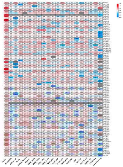 Sequence homology of homologous genes among different germplasms. Coloured squares indicate protein sequence similarity from zero (blue) to 100% (red). Gray squares indicate no proteins that satisfied the selection criteria.